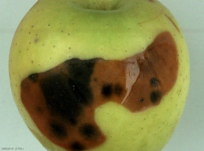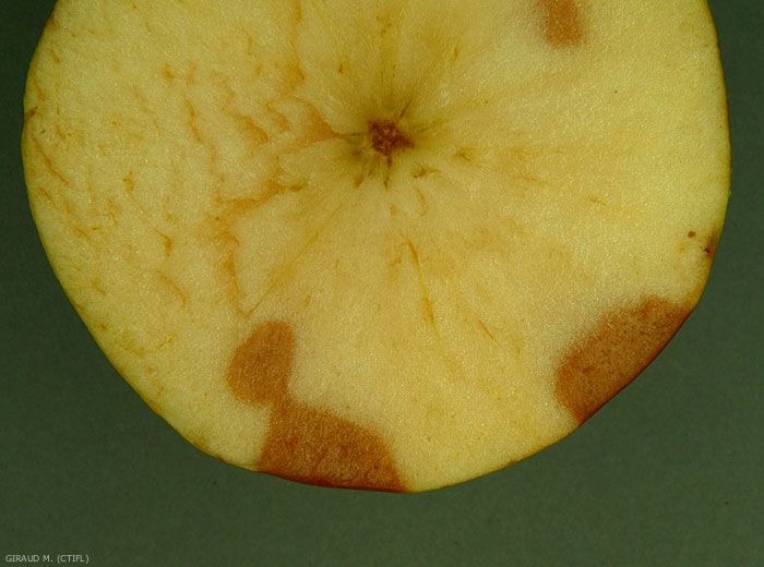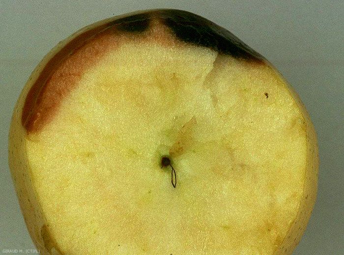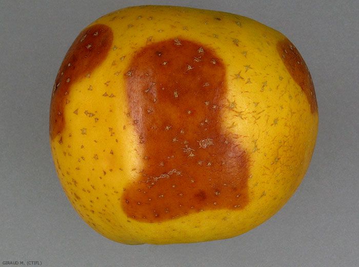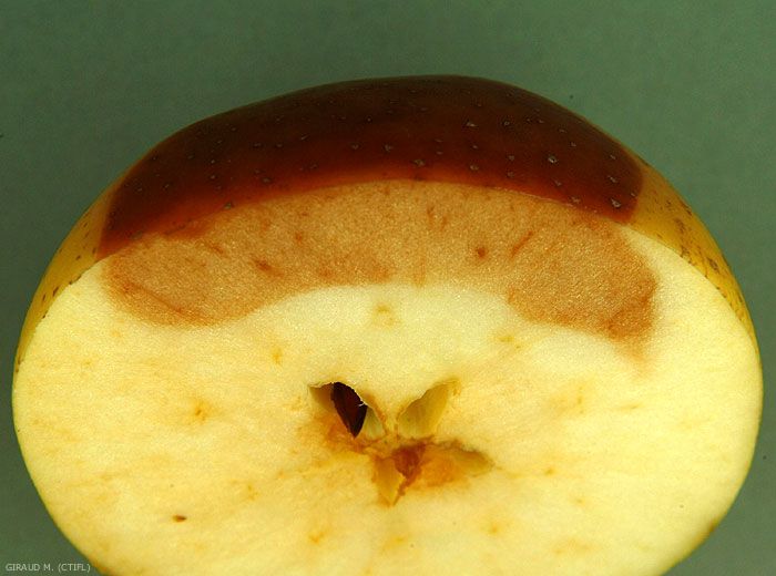 En surface on observe une tache brune à contour net et dont la forme va de l'ovale à la lanière dans le sens équatorial du fruit (figures 1 à 3). En profondeur, les tissus sont bruns et mous jusqu’à 1 à 2 cm environ (figures 4 et 5). Des taches noires dues à Alternaria apparaissent parfois (figures 6 et 7). La maladie peut se propager rapidement en cours de conservation de la mi-novembre à la fin décembre.