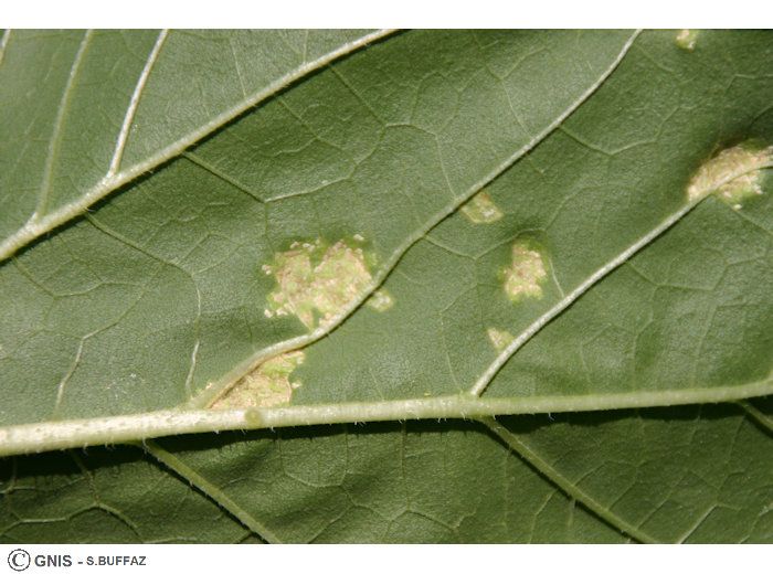 Présence de taches foliaires vert-jaune, boursouflées, le plus souvent localisées dans la partie apicale de la feuille. A la face inférieure de la feuille et au niveau des cloques, on observe la présence de croûtes blanc crème.