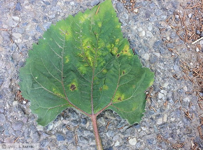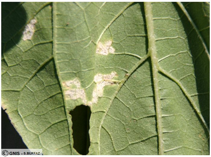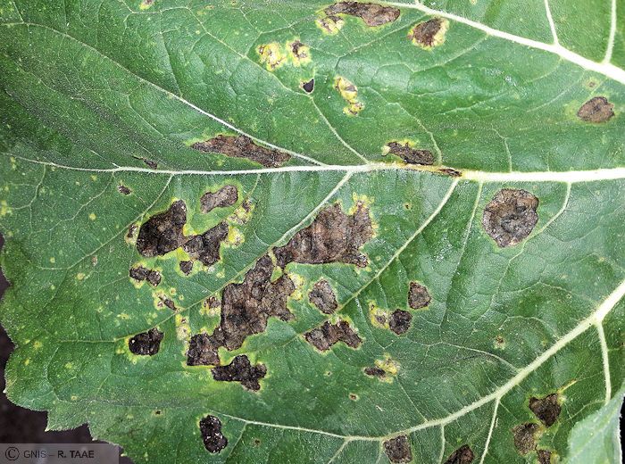 Des symptômes peuvent aussi se déclarer sur pétioles, tige et bractées du capitule, sous forme de taches superficielles vert glauque et d’un aspect huileux.