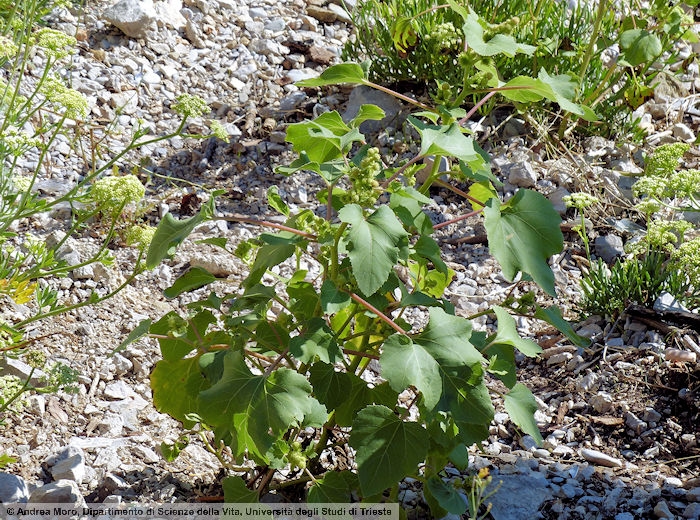 La lampourde d’Italie est une astéracée annuelle. Elle peut atteindre 1 m de haut. La tige est d’un rouge brunâtre. Les feuilles sont cordées (en forme de cœur), possèdent un long pétiole et leur surface est rude au toucher. La floraison s’effectue entre juillet et octobre et donne des fleurs verdâtres. Les fruits mesurent 2 cm de long et sont densément recouverts d’épines. Deux aiguillons crochus sont situés à l’extrémité.