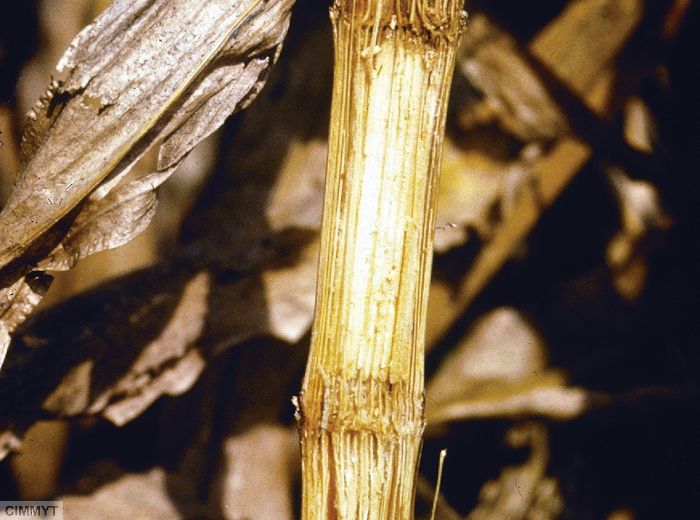 Entre-nœuds : perte de la coloration verte, évolution vers du marron ou couleur paille, spongieux et facilement écrasés. Amassement de pycnides sombres et sous-épidermiques. Développement d’une moisissure blanche à la surface parfois.