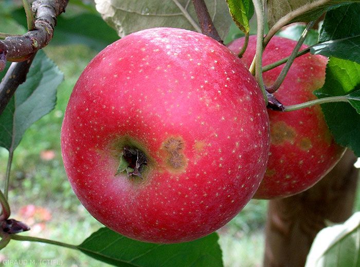 Sur fruits ce sont d'abord aux tout premiers stades, des décolorations de l'épiderme en dépression, présentant ensuite une espèce de rugosité dans la partie centrale. Mais le symptôme caractéristique est celui de petites croûtes brunes, très superficielles, plus ou moins craquelées en étoile (Figure 1). On observe aussi parfois des zones rugueuses en forme de goutte dans la cavité oculaire.