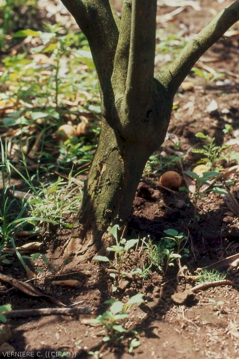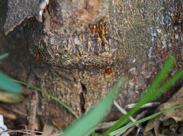 - Si attaque des racines, le dépérissement de l'arbre ou du jeune plant se produit alors de façon généralisée sans exsudation de gomme.