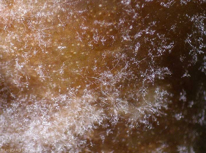 - Sporulation : par les stomates, parfois directement au travers de l'épiderme (figure 2). Production de nombreux sporangiophores (figures 3 à 6) et sporanges citriformes (figures 7 et 8), plusieurs milliers par taches.
