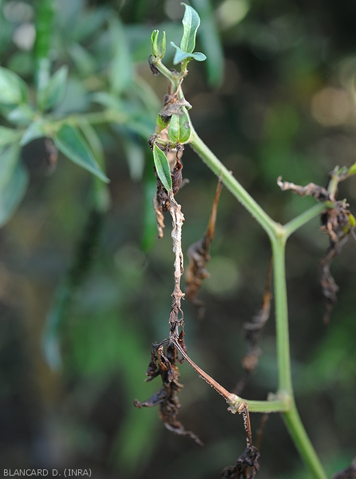 Lésions chancreuses brunâtres, plus ou moins ratatinées, rapportées aussi sur tiges de tomate.