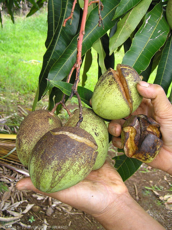 • Fruits : taches circulaires noires de plus de 5 mm de diamètre se forment à la surface de l'épiderme sous lesquelles la pulpe brunit et pourrit.