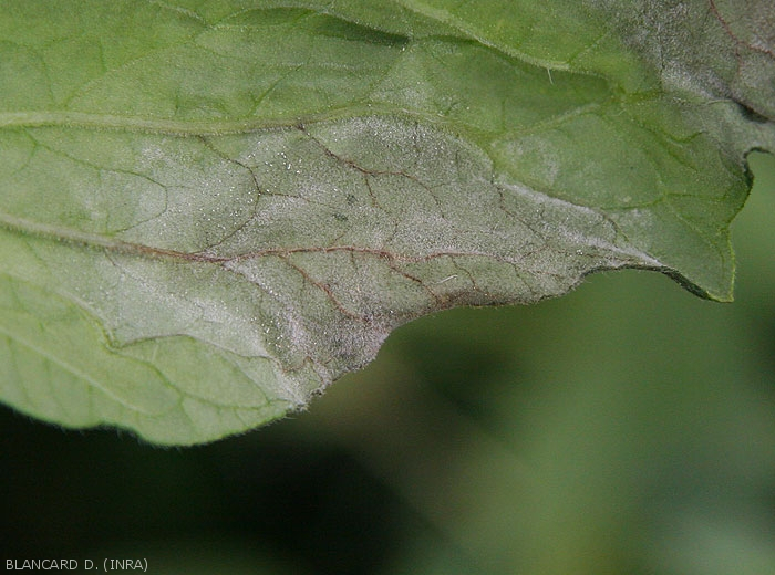 Au niveau de ces taches, un feutrage blanc ou grisâtre apparait, surtout en conditions de forte humidité ; sur folioles il n’est présent que sur leur face inférieure. Ce feutrage porte les spores du parasite, qui assurent sa reproduction, mais aussi sa dissémination (tomates, mais aussi pommes de terre) sous l’action de la pluie et du vent. Ces spores sont ainsi responsables de la propagation de l’épidémie, de proche en proche, à d’autres parcelles ou jardins voisins ou plus éloignés.