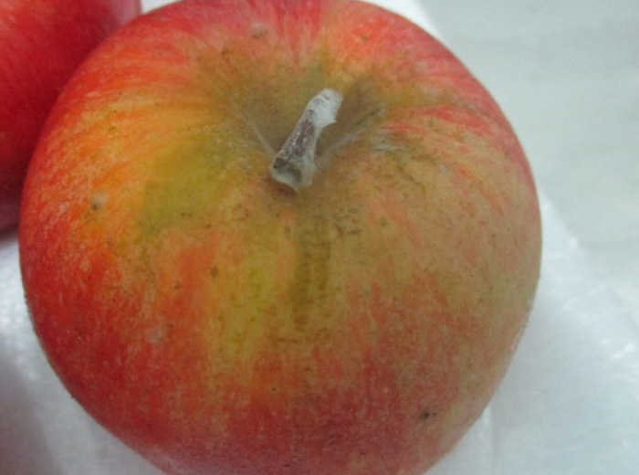 - Feutrage superficiel, de couleur généralement gris clair ou blanc, d’intensité variable, se développant à la surface des pommes, sur l’épiderme (figure 3), ou sur le pédoncule (figures 1 et 2).