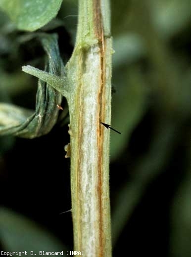 Des coupes longitudinales (figures 4 à 6) ou transversales (7 et 8), effectuées à plusieurs niveaux de la tige, révèlent des symptômes plus ou moins marqués en fonction du stade d'évolution de la maladie . Ainsi, on peut constater :