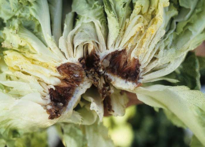 Quelques taches sombres sont parfois visibles sur les feuilles. Par la suite, une pourriture humide, visqueuse, brun foncé à noire s'initie sur quelques feuilles puis gagne l'ensemble de la pomme ("slime head") (figure 5). A terme, les salades touchées peuvent se liquéfier complètement (figure 6). Aucune structure particulière n'est observée sur les tissus contrairement aux champignons parasites responsables de flétrissement et de pourritures foliaires (Botrytis cinerea, Sclerotinia spp.).