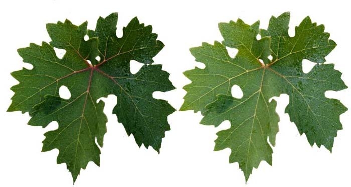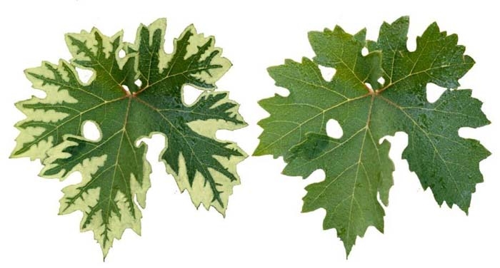 Feuilles : petites, dissymétriques, et en forme de palmettes avec un sinus pétiolaire ouvert. Les pétioles sont anormalement courts et gros. Feuillage buissonnant. Rameaux : les mérithalles ou entre-noeuds sont plus courts, aplatis et plus nombreux. Baies : manifestation de coulure et de millerandage. |