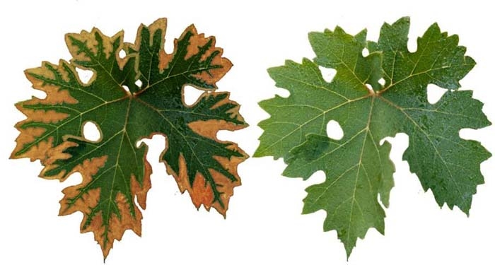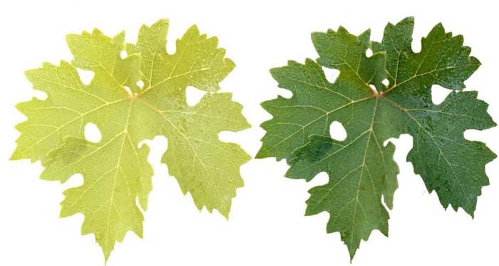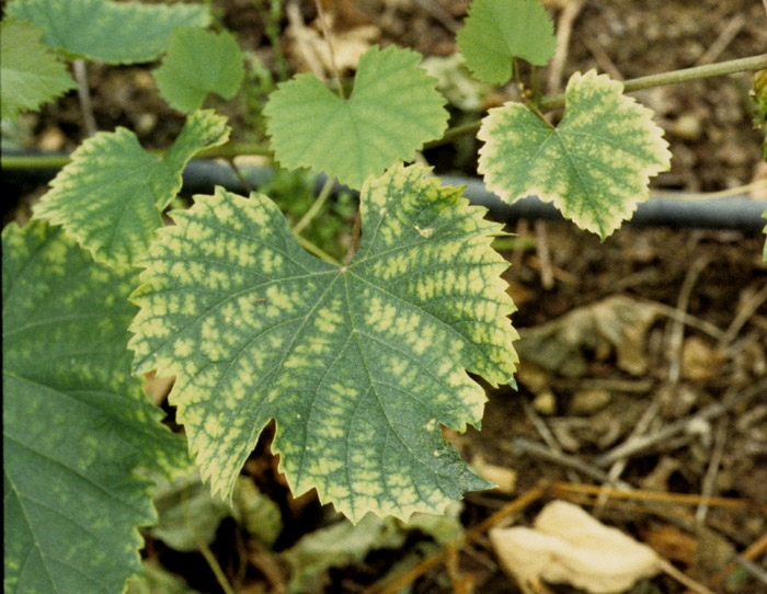 Feuilles : jaunissement marbré inter-nervaire (figure 9), les nervures apparaissant plus proéminentes. Grappes : plus petites présentant une maturité incomplète. |