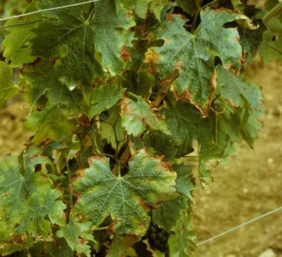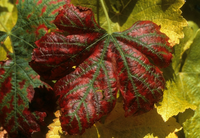Réduction de la vigueur et de la vitalité des souches. Feuilles : décoloration du limbe variant du jaune au rouge-orangé en fonction des cépages (figure 5). Chute des feuilles. Sarments : maturité anticipée, aoutement prématuré. Baies : diminution de la maturation et de la quantité. |