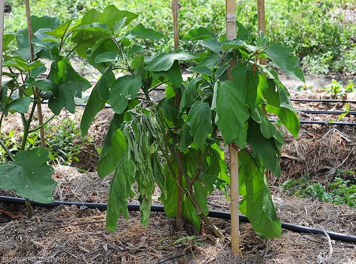 Flétrissement rapide des jeunes feuillesaux moments les plus chauds de la journée, souvent réversible durant la nuit dans un premier temps (figure 1) ; ils se manifestent soudainement et deviennent permanents. Les folioles et les feuilles finissent par se dessécher comme les plantes entières à terme (figure de 2).