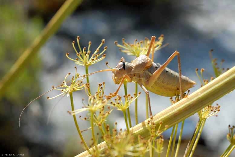 Les caelifères (ex. criquets) sont diurnes et consomment prioritairement des Poaceae (graminées). Lors de la ponte l'abdomen pénètre presque entièrement dans le sol ; les oeufs sont enfouis en groupes dans le sol, enrobés ou surmontés de matière spumeuse. Les ensifères sont plutôt nocturnes et leurs oeufs sont souvent déposés isolement dans les plantes.