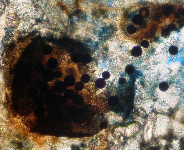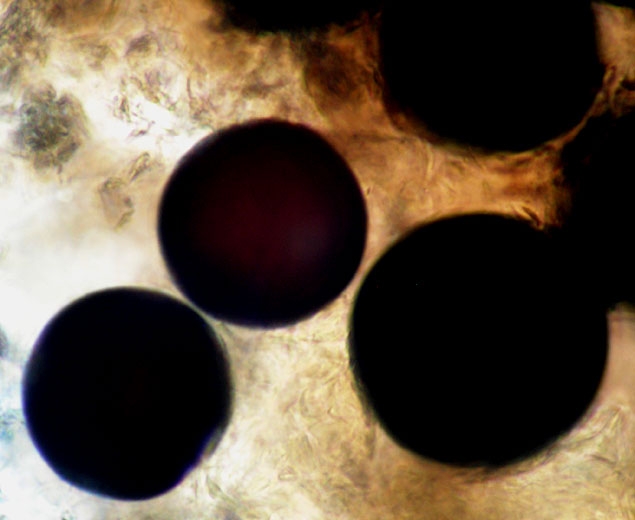 M. cannonballus forme des périthèces sphériques et noirs (mesurant entre 40 et 50 µm de diamètre) dans les tissus racinaires (figures 1 à 4 et 7), ceci tardivement en saison après la récolte ou la mort des plantes. A maturité, ces structures renferment de nombreux asques contenant chacun une ascospore sphérique (figures 4 à 6, 8 et 9). Plusieurs centaines de milliers d'ascospores pourraient être produites et libérées à partir d'un système racinaire d'une plante de melon malade. Ces ascospores se répartiraient verticalement et horizontalement dans les sols cultivés de façon uniforme. Leur nombre est tout de même plus élevé dans la strate superficielle du sol.