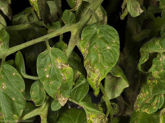 I sintomi indotti dalla Septoria lycopersici vengono talvolta confusi all'inizio dello sviluppo con quelli in particolare dell'alternaria. Così, piccole macchie circolari, inizialmente umide, appaiono sulle lame delle foglie vecchie. Si estendono leggermente, assumono una tinta marrone e rimangono limitate a un diametro compreso tra 2 e 6 mm (Figure 1 e 2). Un alone clorotico li circonda più o meno e il loro centro si necrosi e assume un'abbronzatura fino a una tinta biancastra.