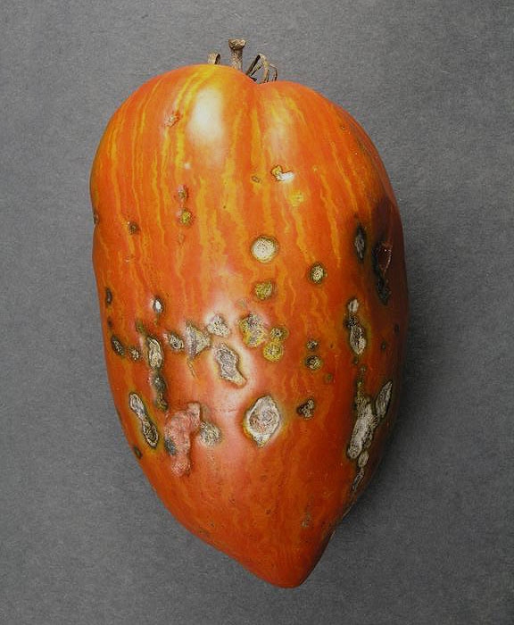 Sintomi piuttosto comparabili, ma di estensione più limitata e di colore più scuro, sono descritti sugli altri organi aerei del pomodoro, come ad esempio sui frutti (figura 4); la loro descrizione è tuttavia piuttosto imprecisa in letteratura.