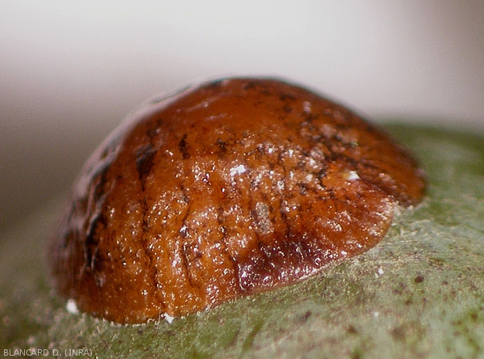 La femmina adulta ha la forma di uno scafo ovale a "bombetta", dal marrone al rossiccio lungo da 4 a 6 mm che rimane incollato al supporto durante la deposizione (figura 3). È una specie molto polifaga.