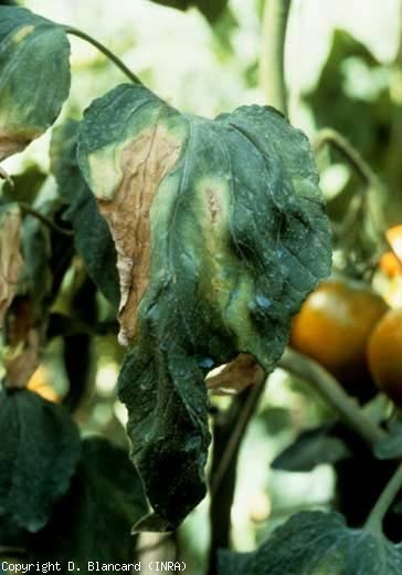 Comme de nombreuses autres maladies vasculaires, les attaques de verticilliose sur tomate se traduisent par le flétrissement des plantes au moment les plus chauds de la journée. Les folioles ne tardent pas à présenter un jaunissement internervaire du limbe, qui prend la forme d'un « V » (figures 1 et 2). Progressivement, les tissus foliaires se nécrosent et se dessèchent dans la partie centrale des décolorations (figure 3). Au fur et à mesure de la progression de la maladie, plusieurs folioles et feuilles montrent des symptômes comparables.