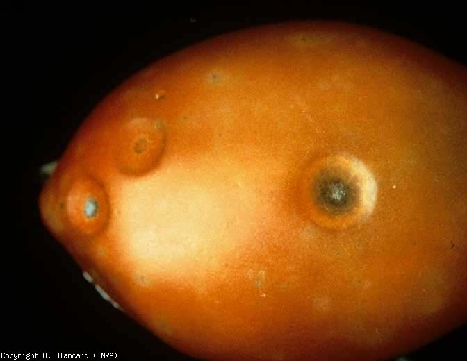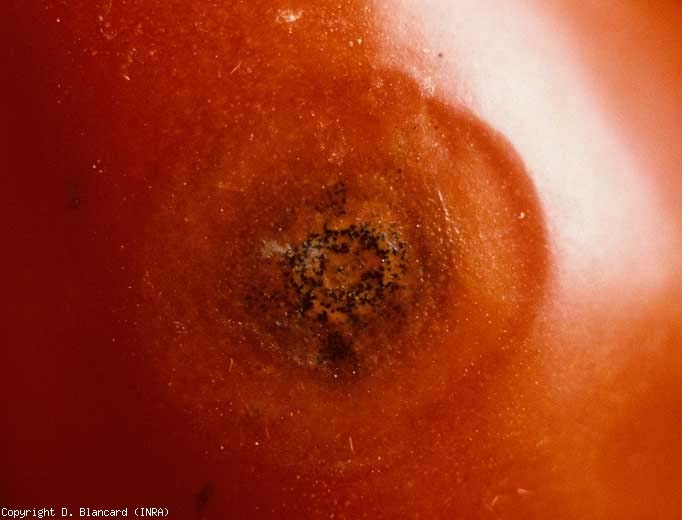 Sui frutti , i sintomi dell'antracnosi compaiono a maturità come minuscole lesioni marrone chiaro , che si sviluppano progressivamente in piccole macchie circolari, umide, opache. Man mano che si estendono, diventano concavi e il loro centro diventa gradualmente marrone (figure da 1 a 3). La carne sottostante è piuttosto scolorita e di consistenza granulosa. A volte sono visibili anelli concentrici, così come strutture dal marrone scuro al nero: i microsclerozi di C. coccodes . Possiamo anche osservare acervuli in cui stare setole nere ( setole ) . Questi acervuli producono, nei periodi umidi, masse di spore mucose color salmone ben visibili sulla superficie delle lesioni che rimangono lisce ed intatte. Spesso, molte macchie si sviluppano contemporaneamente sullo stesso frutto. Alla confluenza finiscono per ricoprire grosse porzioni e danno luogo a marciumi .