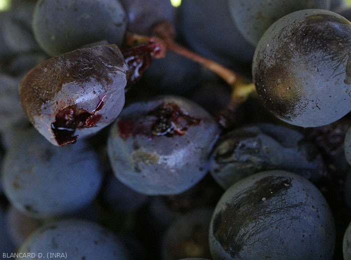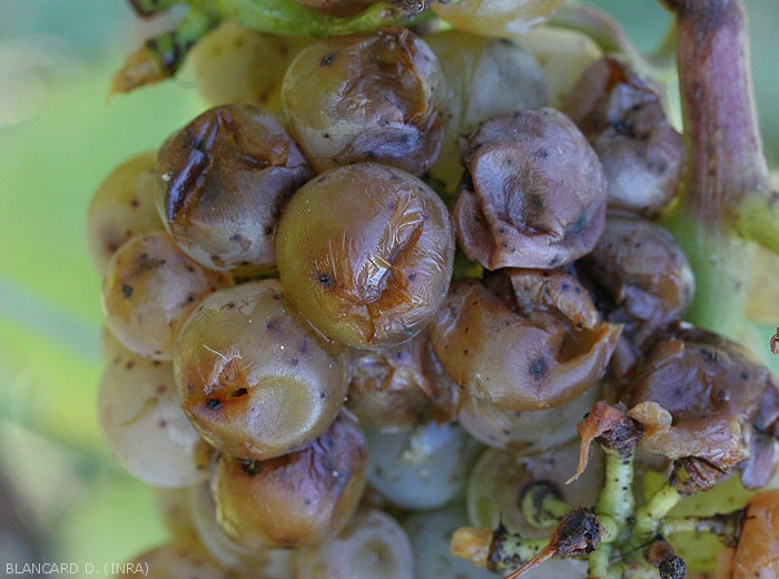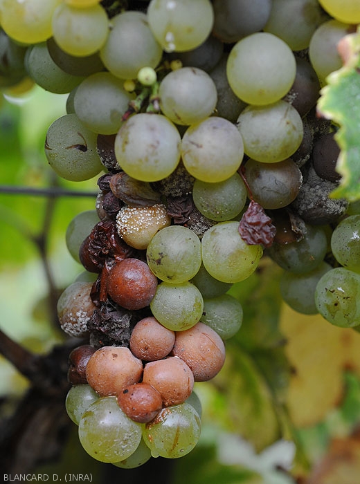 L' acido putrefattivo inizia frequentemente vicino allo stelo attacca baie oa varie lesioni. I tessuti alterati assumono poi un colore che varia a seconda dello stato di sviluppo del marciume e dei vitigni. È piuttosto marrone chiaro sulle varietà bianche (figure da 1 a 7) e dal viola al rossastro sulle varietà rosse (figure da 8 a 10). Una volta avviato, il marciume si diffonde abbastanza rapidamente all'intera bacca che, di regola, mantiene la sua forma. La sua buccia si indebolisce gradualmente e il succo scorre, conferendo un aspetto lucido agli acini adiacenti situati sotto. Più raramente si osservano masse mucose biancastre in seguito alla formazione di colonie di lieviti (figura 5). Questi grappoli non vanno confusi con le tante uova che i moscerini della frutta depongono sulle ferite delle bacche marce. Alcuni cluster possono essere completamente interessati (Figura 11).