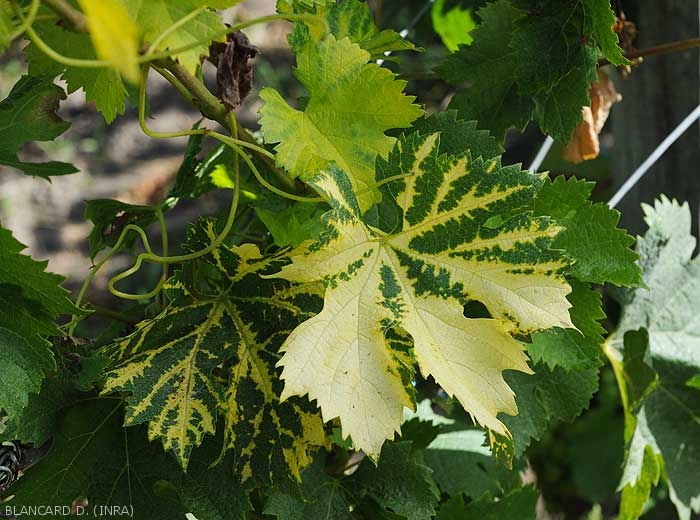 Le foglie che crescono sulle viti malate mostrano varie anomalie nel colore e nella forma. Si possono quindi osservare variegature o mosaici di colore giallo dorato localizzati inizialmente lungo le nervature per poi generalizzare a tutto o parte del lembo fogliare.