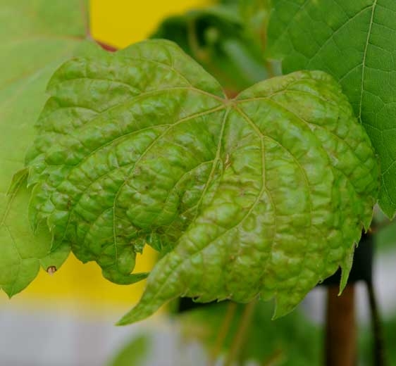 • foglie parzialmente o totalmente deformate, leggermente seghettate o più irregolarmente tagliate o setacciate, screziate, vesciche (figure da 2 a 4) e più o meno arrotolate (glifosato, 2,4-D);
