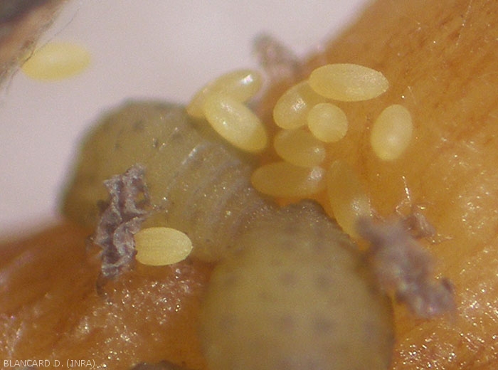 Le uova invernali (figura 1) di Daktulosphaira vitifoliae misurano meno di 0,3 mm, hanno forma ovale e colore giallo-verde, e sono più o meno lucide.