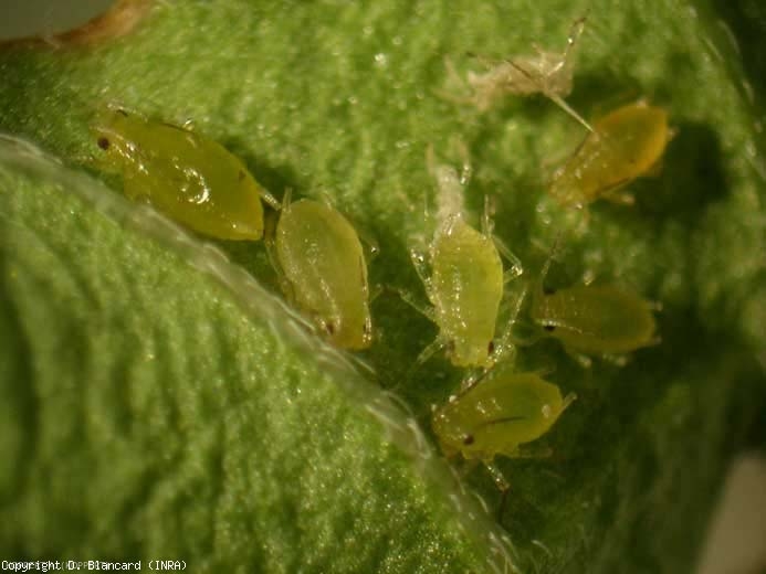 Larve e adulti, spesso presenti sul lato inferiore della lamina e talvolta sul gambo (Figura 6), si nutrono attraverso il loro rostro. Lo zucchero in eccesso contenuto nella linfa viene rifiutato sotto forma di melata.