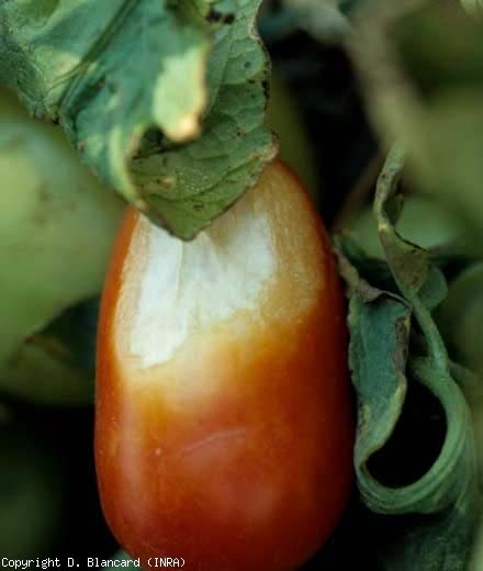 Sui verdi o rotanti scottature ( frutti scottatura , le , solari scottatura solare ) provocano macchie che talvolta compaiono sul lato più esposto alla luce solare diretta, durante periodi climatici molto caldi. Queste lesioni sono irregolari, biancastre al centro e più o meno circondate da un alone giallo (figure da 1 a 4). Sono leggermente depresse, la loro superficie è più o meno rugosa e assume una consistenza secca che ricorda la carta. Spesso superficiali, sono talvolta invase da vari funghi opportunisti, in particolare Alternaria alternata . In questo caso, una muffa dal marrone al nero li copre gradualmente.