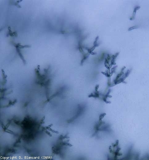 Una volta prodotti in gran numero sui conidiofori (figura 1) sul lato inferiore dei volantini, i conidi (foto 1 e 2) sono facilmente dispersi da vento , correnti d'aria nei ripari, spruzzi d'acqua, attrezzi, vestiti dei lavoratori. Alcuni insetti assicurerebbero anche la diffusione di questo fungo. Maggiore è l'umidità, maggiore è la sporulazione.