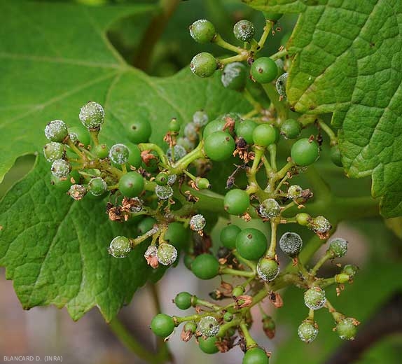 <b> <i> Plasmopara viticola </i> </b>: sintomo di 'rutto grigio' sugli acini immaturi.  L'agente di muffa sporulava pesantemente su quest'ultimo una volta colonizzato.