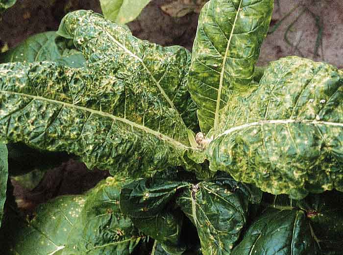 As folhas ficam curvadas em forma de colher, com pontos e anéis necróticos, ocasionalmente bastante semelhantes aos sintomas causados pelo TRSV. Os tecidos das folhas têm uma textura quebradiça e emitem um som seco quando tocados. Lesões necróticas sistêmicas são visíveis no caule e nas folhas.