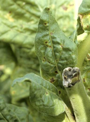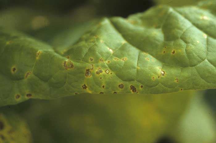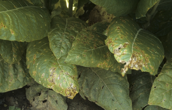 Note que essas duas bactérias também têm características biológicas semelhantes e métodos de controle semelhantes. Seus sintomas frequentemente aparecem em muitas folhas localizados aleatoriamente na planta, tanto no berçário de mudas quanto no campo. As plantas afetadas por essas duas doenças bacterianas costumam apresentar distribuição em focos no campo. Na França, pseudomonas seringae pv. tabaci foi relatada. Em certas ocasioes, essa bactéria foi endêmica em algumas áreas de produção na França e causava danos consideráveis, tanto em viveiros quanto em campos. Esta doença bacteriana é rara, e tem sido observada apenas uma vez nos últimos anos, em Isère (França).