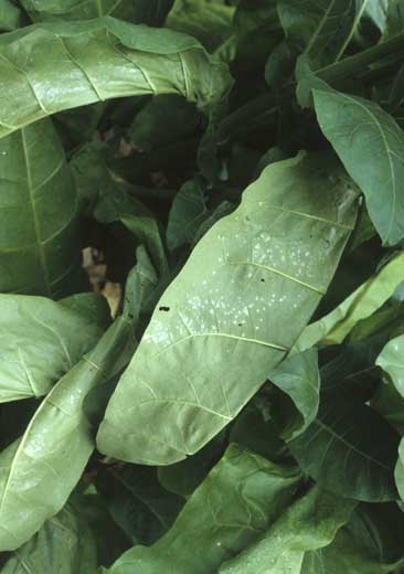 Os agricultores estão acostumados a ver lesões chamadas manchas molhadas, na parte inferior das folhas de tabaco. Eles são primeiro molhados, depois marrons, isolados ou confluentes, às vezes localizados ao longo das veias (figura 1). Em geral, as manchas ficam claras rapidamente (figura 2). Sua aparência está certamente ligada à presença de água no lado de baixo da folha, que é mais sensível que o lado superior. Presumivelmente, a água poderia desempenhar um papel de uma lupa em dias ensolarados e causar queimaduras ou explosão de aglomerados celulares, levando à necrose tecidual. Este fenômeno natural é difícil de controlar.