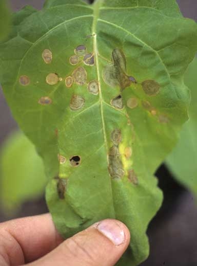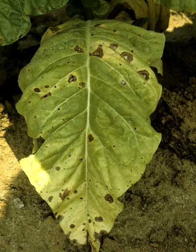 Thanatephorus cucumeris é responsável por uma infinidade de sintomas no tabaco. É um agente comum de amortecimento em viveiros (figuras 1 e 2). Causa redução na germinação das sementes e lesões embebidas em água no caule na linha do solo. Depois, essas lesões tornam-se marrons e gradualmente circundam o colarinho. Simultaneamente, ou mais tarde, as mudas murcham e morrem muito rapidamente, dando a impressão de terem "derretido".