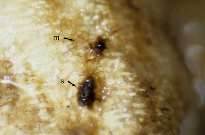 As infecções também podem ser iniciadas pelos basidiósporos. Estes geralmente vêm de um himenio (figura 3) que poderia ter sido formado na superfície do solo, no tabaco já infectado ou em outros hospedeiros infectados. Uma vez nas folhas, os basidiósporos germinam e penetram os tecidos diretamente através da cutícula ou, mais raramente, através dos estômatos. Eles rapidamente invadem os tecidos e produzem ocasionalmente um himênio nas margens das lesões