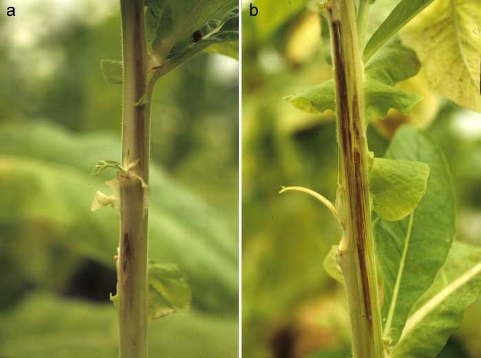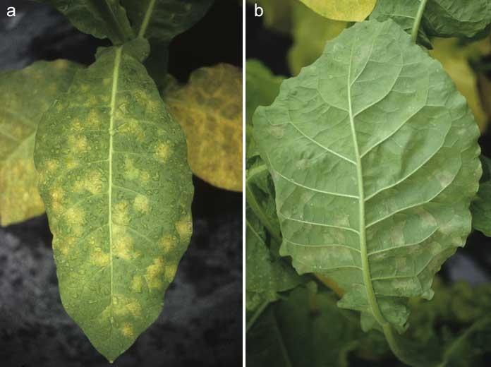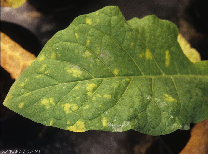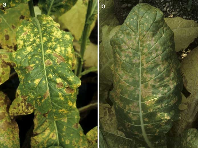 Ocasionalmente, manchas de causa indeterminada (denominadas manchas fantasma) semelhantes às lesões causadas pelo mofo azul foram observadas em campos de tabaco (Figura 1). Essas manchas são diferentes das lesões causadas pelo mofo azul, porque não é possível encontrar umaesporulação cinza no lado de baixo da folha, como é o caso do mofo azul. Assim, recomenda-se que os agrônomos sempre observem os dois lados da folha e procurem a esporulação cinza no lado inferior para confirmar o mofo azul.