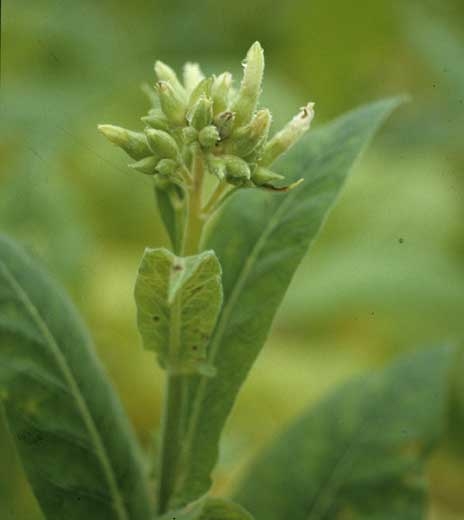 Peronospora hyoscyami f. sp. tabacina desenvolve no tabaco durante todo o ciclo de crescimento. Nas mudas, o desenvolvimento da doença é muito rápido. Rapidamente invade as folhas, cobrindo-as com massas de conídios azuladas e difusas. Também causa distorção nas folhas, podridão leve ocasional e, eventualmente, morte.