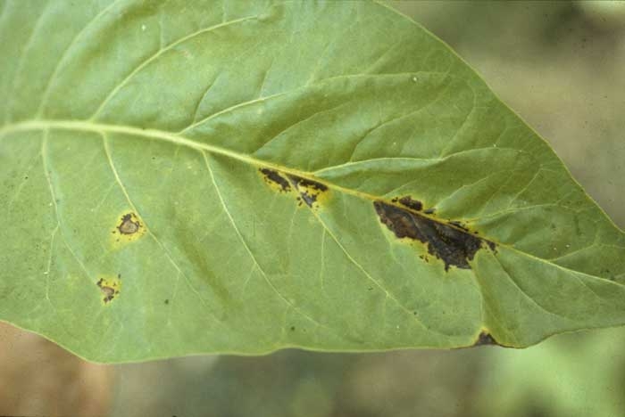 Pectobacterium carotovorum subsp. carotovorum (anteriormente Erwinia carotovora subsp. carotovora) causa grandes lesões escuras e úmidas nas folhas de tabaco (figuras 1 e 2). Um halo amarelo, devido à toxina emitida pela bactéria pode ser observado ao redor das manchas (figura 2). Note que as partes florais (figura 3) também podem estar infectadas.