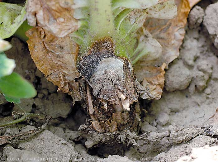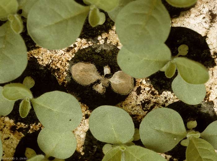 Quando as condições climáticas são favoráveis, produz um mofo cinzento característico (figuras 9, 12, 16) em todos os órgãos atacados, daí o nome da doença.