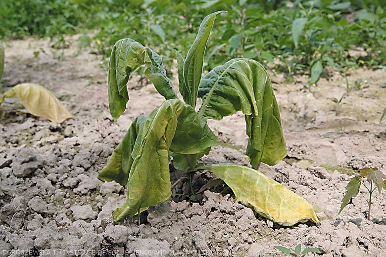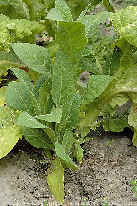 No campo, provoca manchas foliares de cor castanho a bege que são por vezes concêntricas e rodeadas por um halo amarelo. A doença foliar normalmente se desenvolve próximo à colheita (figuras 9 a 11). Além disso, Botrytis cinerea induz cancros da haste/caule após ter colonizado os sitios onde ocorreram desfolhamento (figuras 14 a 16). O fungo crescer em fumo durante o processo de cura. (veja a seção Curando doenças do celeiro).