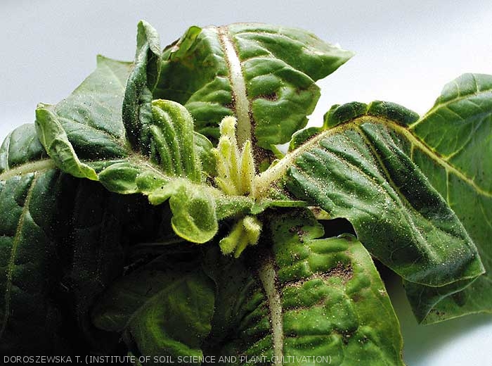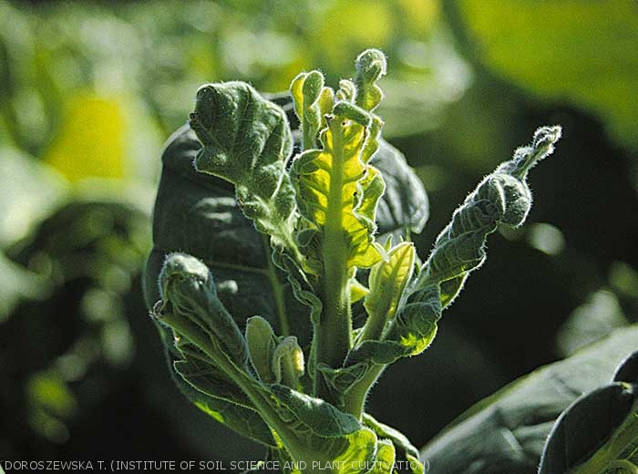 - Deficiência de boro (B): folhas jovens são distorcidas. A lâmina na base da folha fica verde claro e pode quebrar mais tarde. As folhas mostram grandes deformações e o botão terminal pode morrer ou parar de crescer (figuras 8 e 9). O boro está envolvido na utilização de cálcio. Este oligoelemento é um cofator na síntese de ácidos nucléicos e está envolvido na integridade da membrana.
