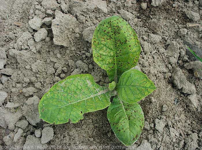 ♦ uma mancha difusa ou clorose bastante localizada nas folhas inferiores, com ou sem manchas necróticas e / ou um leve ressecamento;