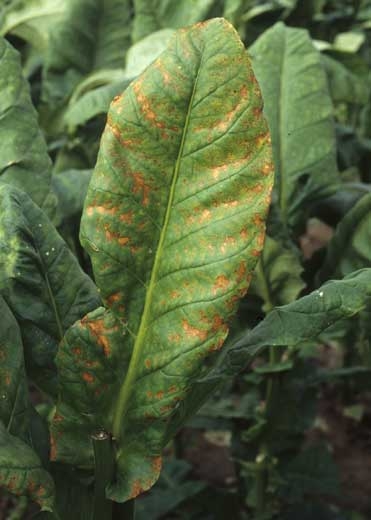 Ocasionalmente, pode-se observar uma necrose marrom-avermelhada entre as veias das folhas inferiores das plantas de tabaco (figuras 1 e 2). Muitas vezes ocorre simultaneamente em vários campos da mesma área de produção. Em geral, as variedades de tabaco escuro parecem mais sensíveis a esta doença.