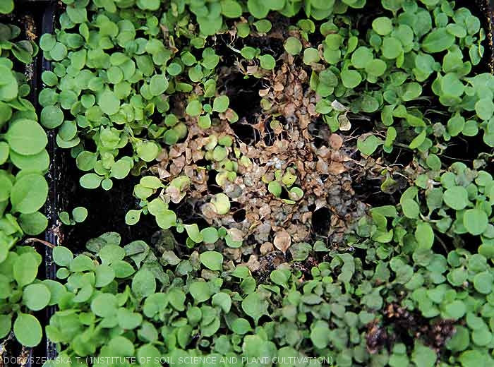 Infeccoes podem ocorrer depois do plantio. Tipicamente, a doenca ocorre do campo durante periodos de condicoes ambientais favoraveis (humida) e na presenca de isolados agressivos do patogeno. Sintomas incluem escurecimento e morte de raizes e apodrecimento do cortex da raiz e da porcao enterrada do caule. A presenca de oosporos pode ser obervada em tecidos infectados com o auxilio do microscopio.
