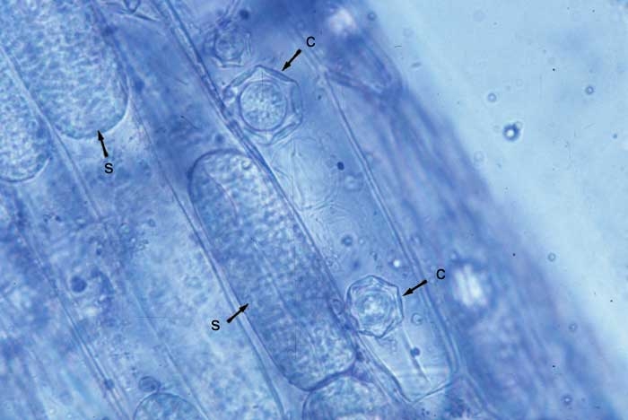 A contaminação ocorre através de zoósporos uniflagelados, produzidos por esporos em repouso ou esporângios. Eles são atraídos para se hospedarem nas raízes, encistam na superfície e penetram diretamente nas células. Ali, o fungo produz um ou mais esporângios agregados que formam zoósporos, garantindo assim a contaminação secundária.