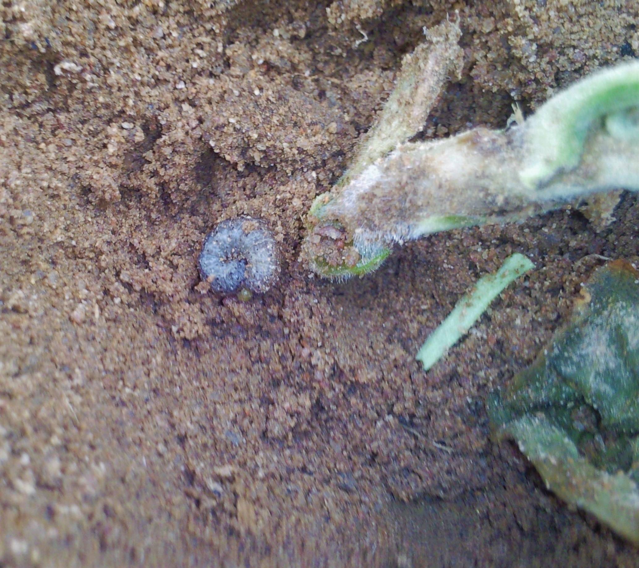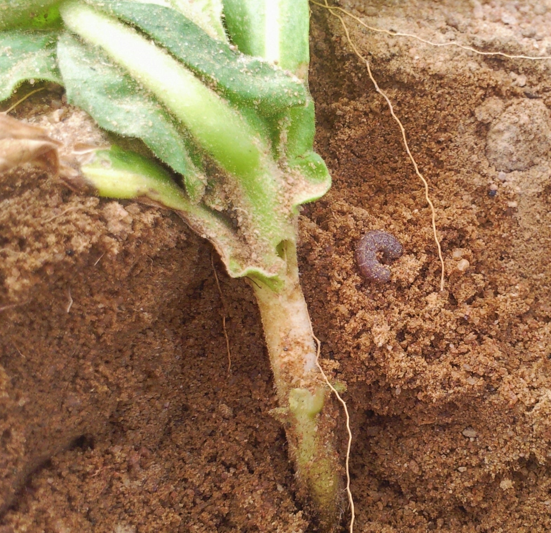- Lagartas de várias traças (Agrotis spp ...) que perfuram, comem e cortam o caule ao nível do solo também são frequentemente observadas. Eles estão comumente presentes no solo ao redor das plantas (figura 2);