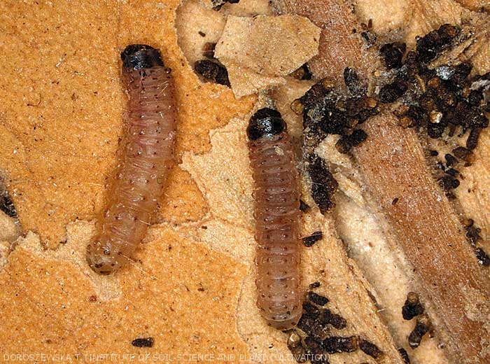 Lasioderma serricorne F. (1792) ("besouro do cigarro" ou "escaravelho do tabaco") é um inseto cosmopolita, que se alimenta de ervas, couro, especiarias, material vegetal seco e livros. O besouro adulto (Anobiidae) é marrom-avermelhado. A larva é um pequeno verme coberto de pelos brancos, que possui mandíbulas longas e poderosas (figura 1). As larvas jovens fazem galerias em pilhas de folhas de tabaco. Uma vez que a larva tenha atingido seu pleno desenvolvimento, ela se aproxima das áreas externas das pilhas, antes da pupação. O besouro adulto emerge da câmara pupal fazendo um pequeno orifício para o exterior. O ciclo de vida, do estágio do ovo até o adulto, dura cerca de dois meses. Há mais de quatro gerações por ano em regiões mais quentes.
